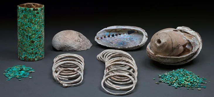 Besides differences in size, great house excavations have also produced a number of luxury goods that are absent from common homes. Many of these luxury items were brought in from large distances, like shell bracelets from the Pacific Coast, and macaw feathers, copper bells and cacao beans that were sourced from Mesoamerica. The presence of these luxury goods does not only show that Chaco was part of a broader trade network with other Mesoamerican states, it also shows that great houses monopolized access to those items.