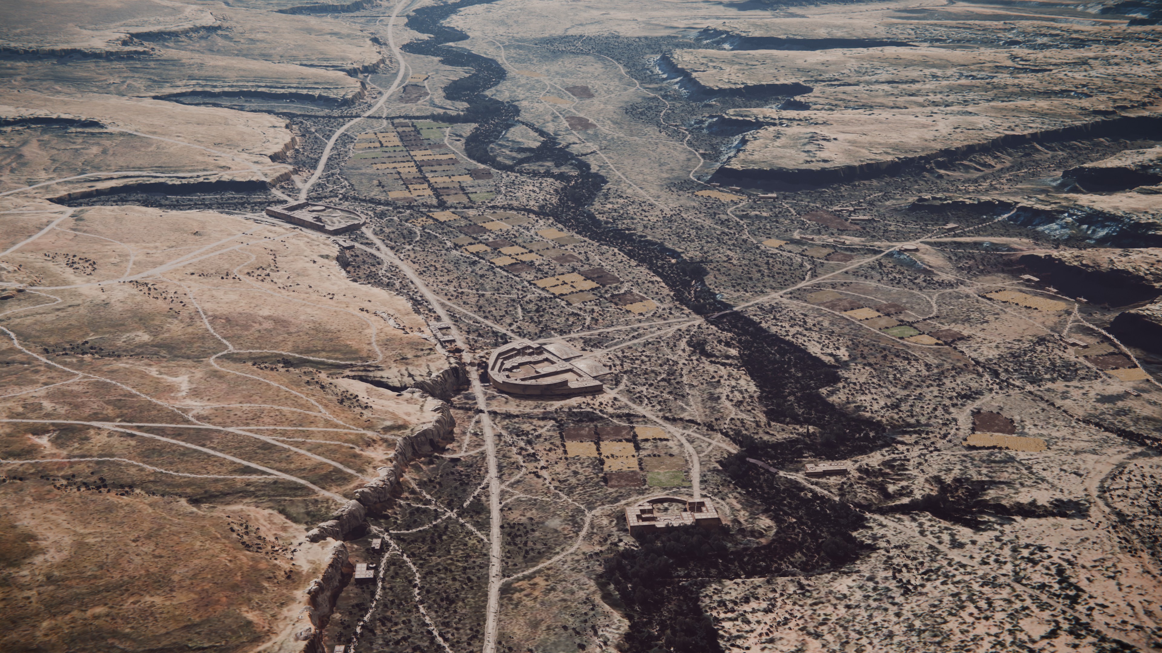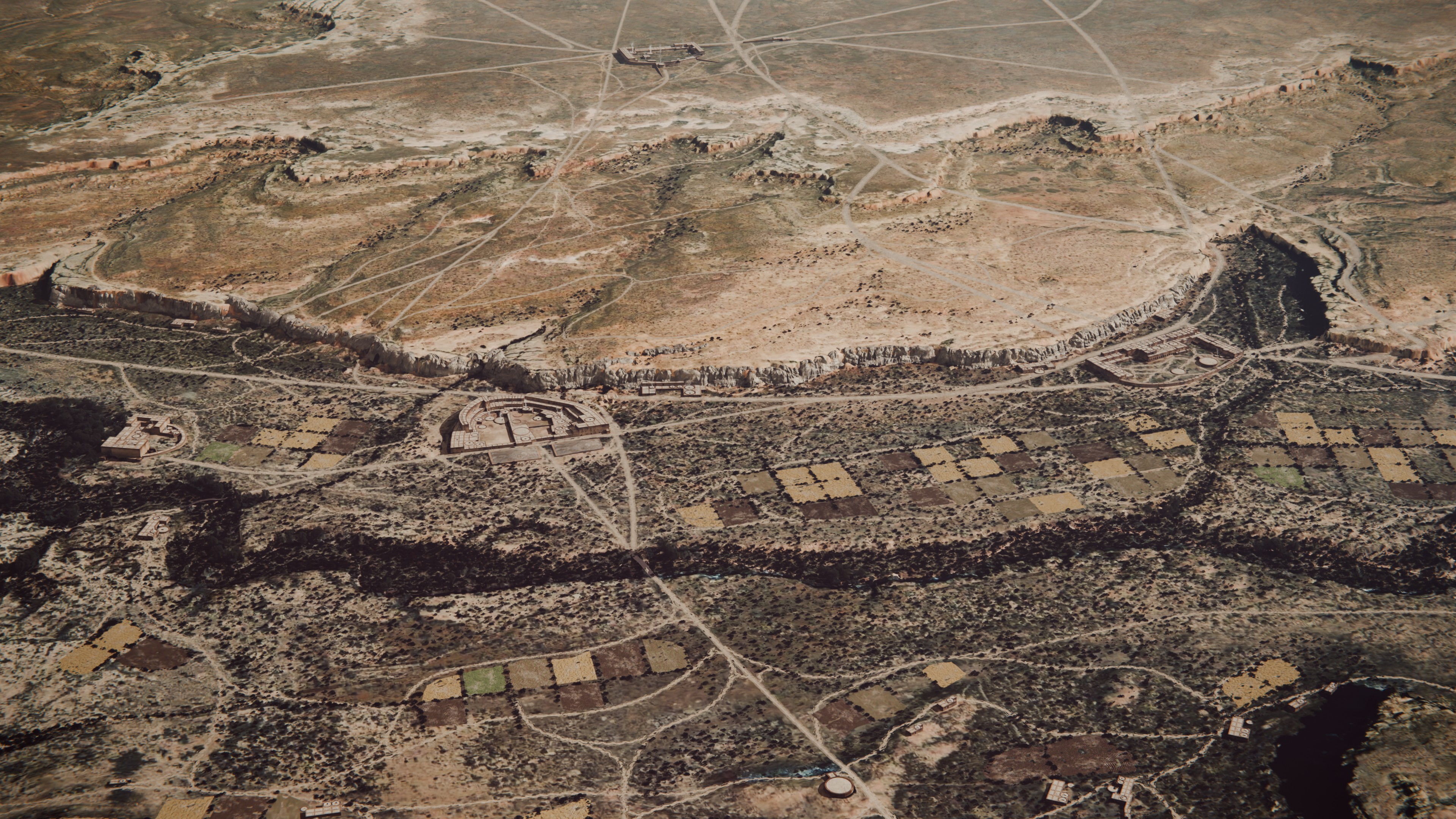Chacoans built most of their constructions in the sides of the canyon, especially in the North bank, near the cliff walls and away from potential wash flooding. There is also evidence of irrigation farming in the valley floor, with distribution channels and regular sized plots.