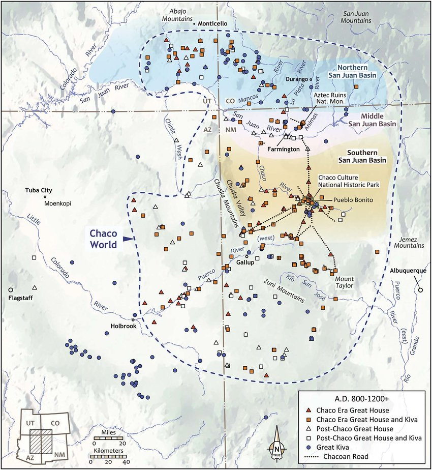 Locations of Chaco and post-Chaco-era great houses and great kivas within the Chaco World, by Catherine Gilman from Evaluating Chaco migration scenarios using dynamic social network analysis. (2018).
