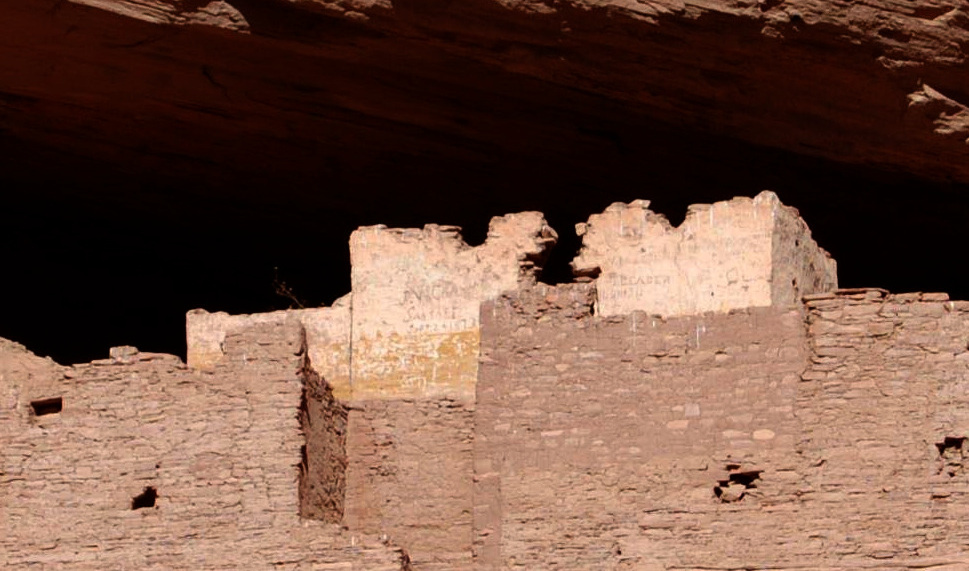 The white and red painting of the façade shown in this reconstruction is speculation. Most of the original plaster of Chetro Ketl has been lost to the elements and walls were usually covered in brown mud plaster. However, there are some walls in Chaco and in other related sites like, Aztec ruins, Mesa Verde and Canyon de Chelly (picture on the right), where white plaster with color motifs are still preserved. Maybe that technique was also used for some of the façades in Chaco. It’s fun to image what a great house could be like with a more colorful look!