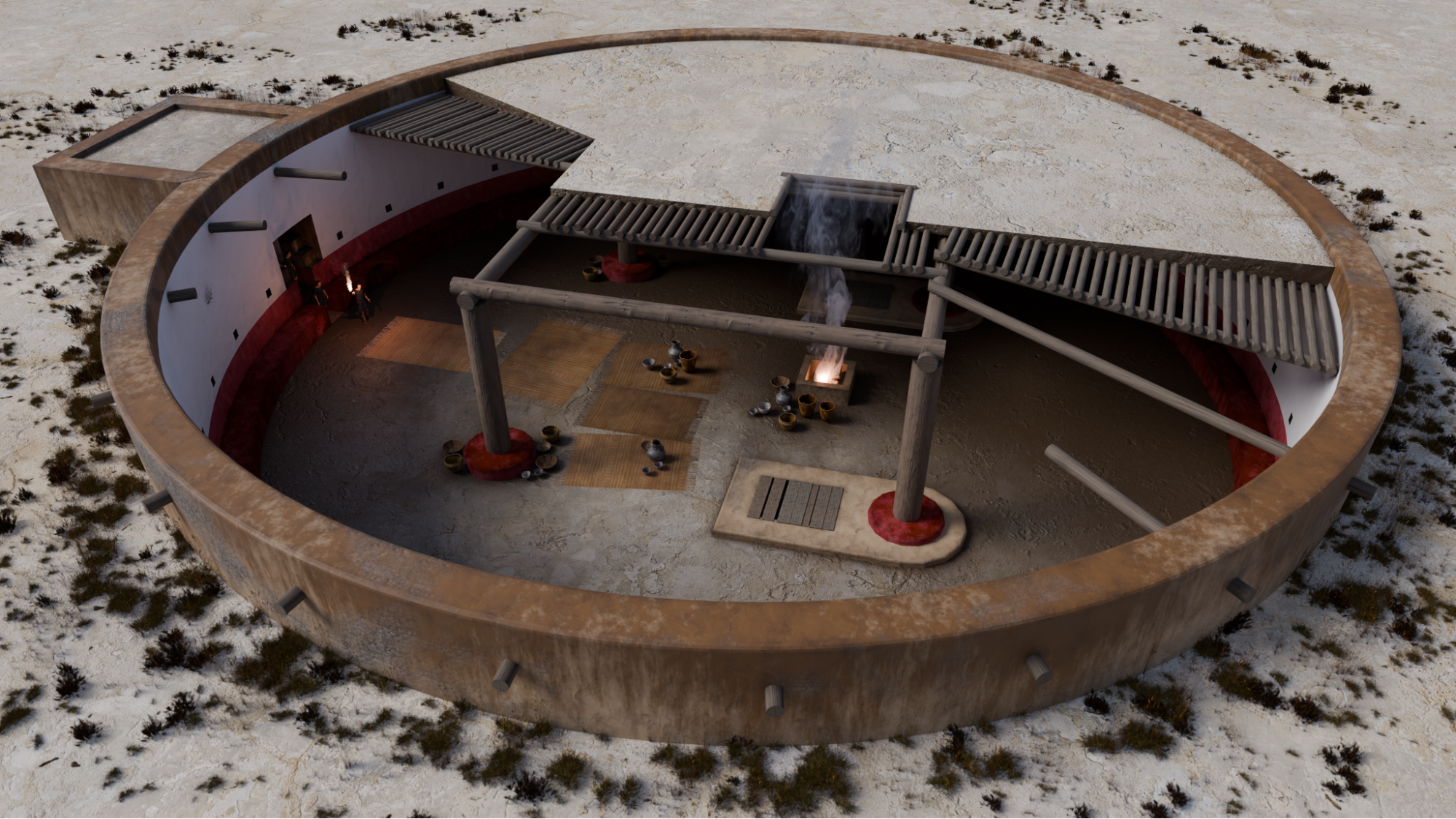 On the inside, kivas often had a domed roof. The dome could be created using curved beams and plastered wainscotting, like the reconstruction above, or by approximation of rows of logs that created a cribbed structure, like the one here. The top of the dome was filled with soil to create a flat roof, usually leveled with their surrounding elements.