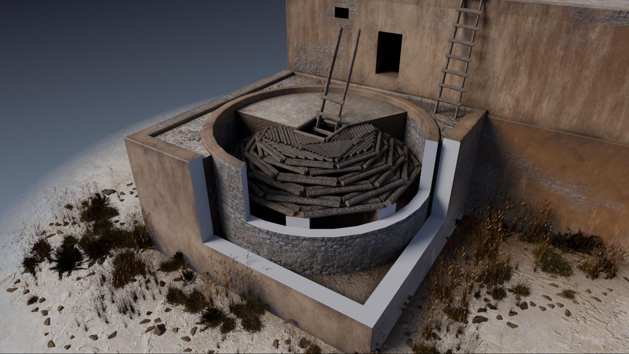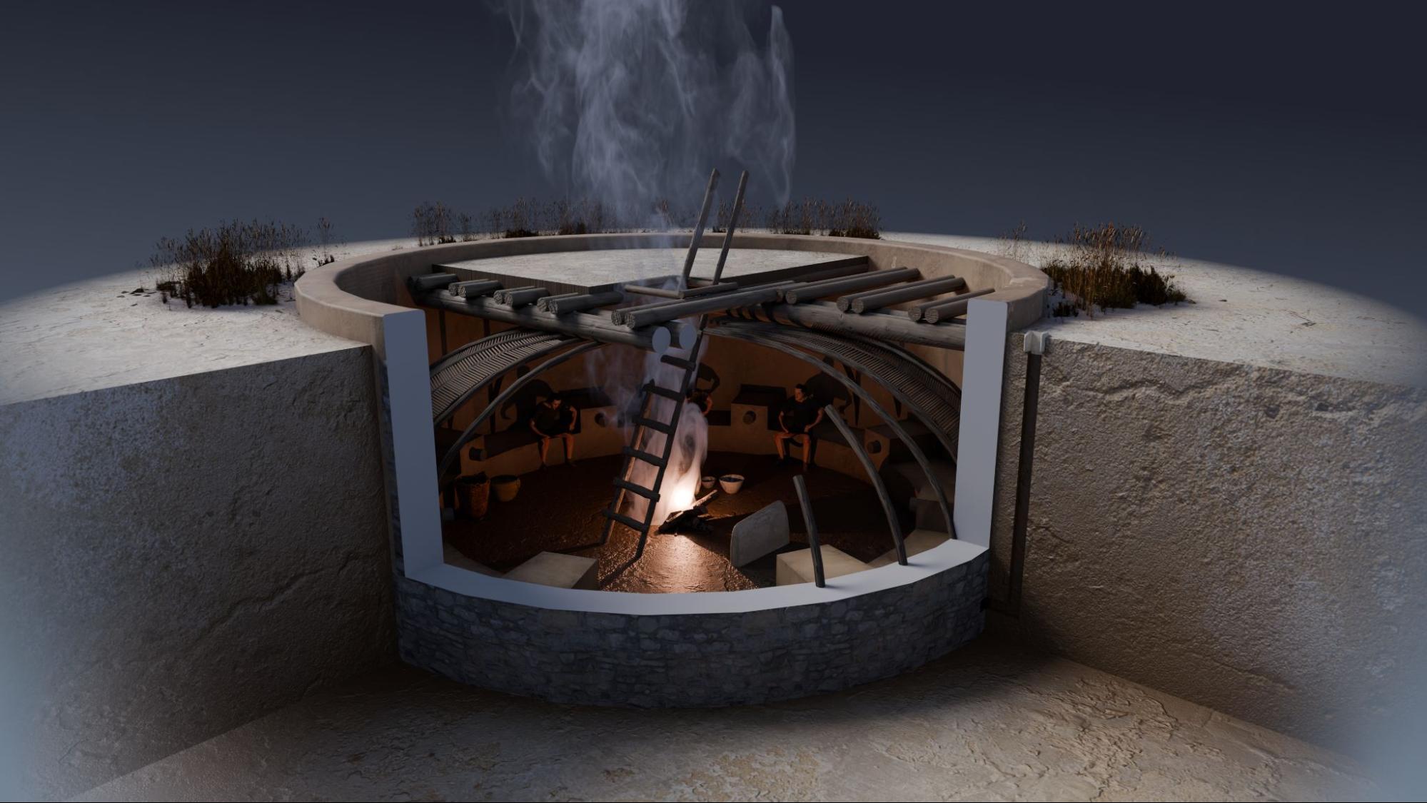 Kivas probably evolved from pithouses dug in the ground, common in previous periods. Many Chacoan kivas were dug underground, but there were also kivas built above ground, embedded in building units. Access to the kiva was possible through a small hatch opened in the roof with a ladder. Kivas have a hearth in the middle that uses the hatch as a sort of chimney, a masonry bench around the base of the wall, and a shaft dug on the side for ventilation.